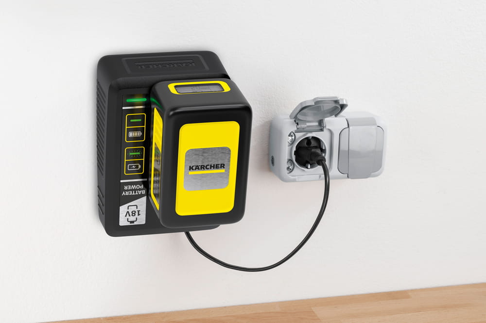 Ładuje wymienny akumulator 18 V/2,5 Ah Kärcher do 80% w 44 minuty oraz do 100% w 82 minuty.