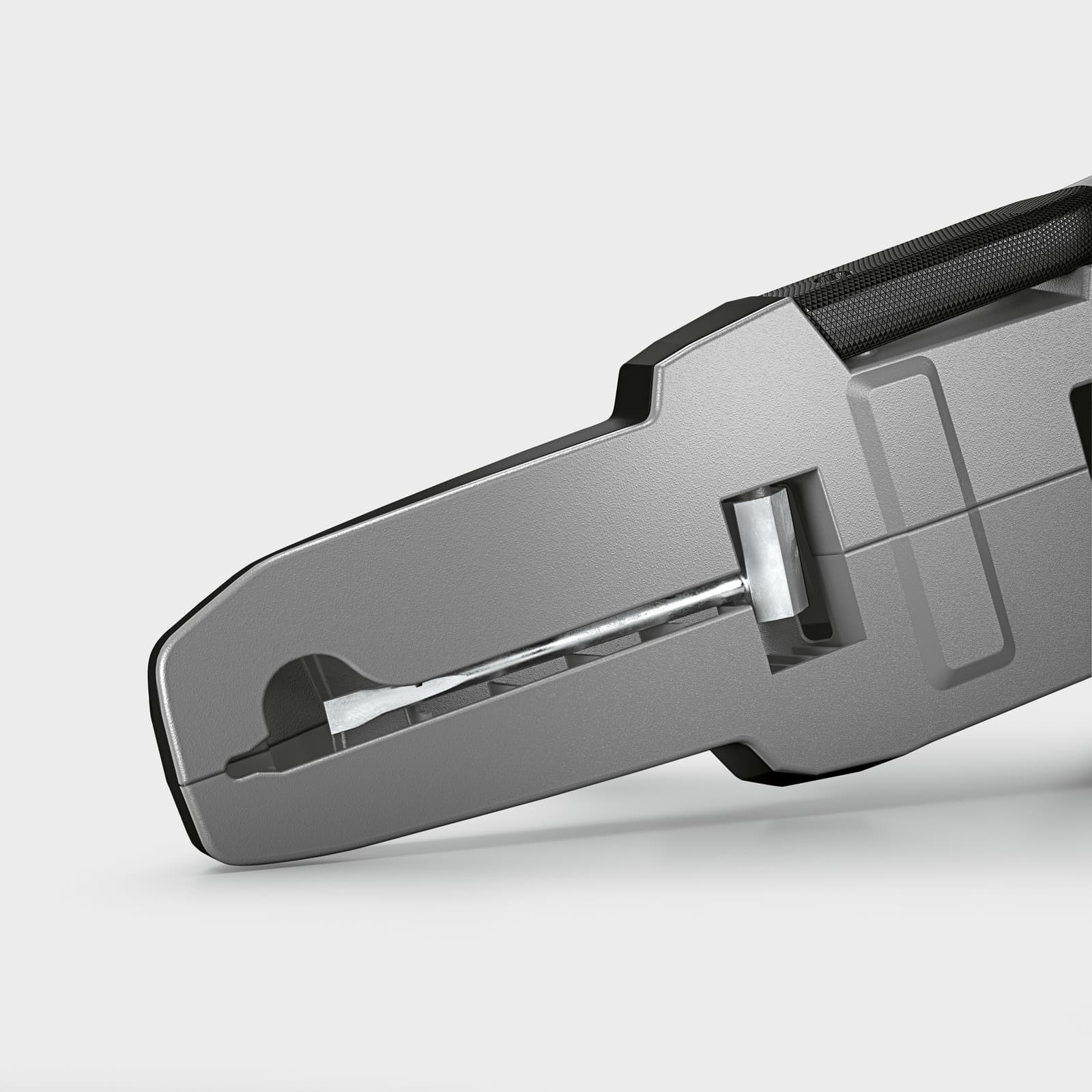 - Urządzenie posiada kolce zderzaka, zapewniające bezpieczne prowadzenie i precyzyjne cięcie.