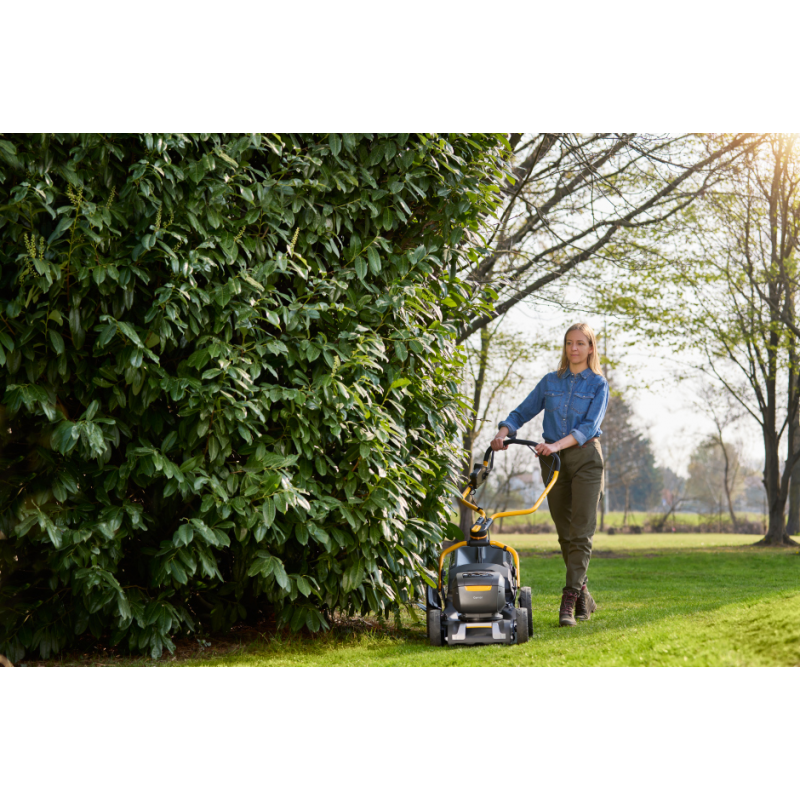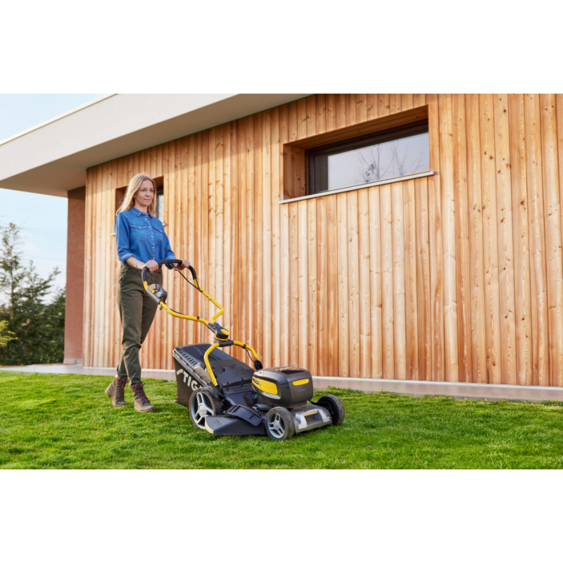 Kosiarka Stiga 753e V dzięki wyposażeniu dwóch akumulatorów 48V 5Ah jest w stanie skosić 600 m².