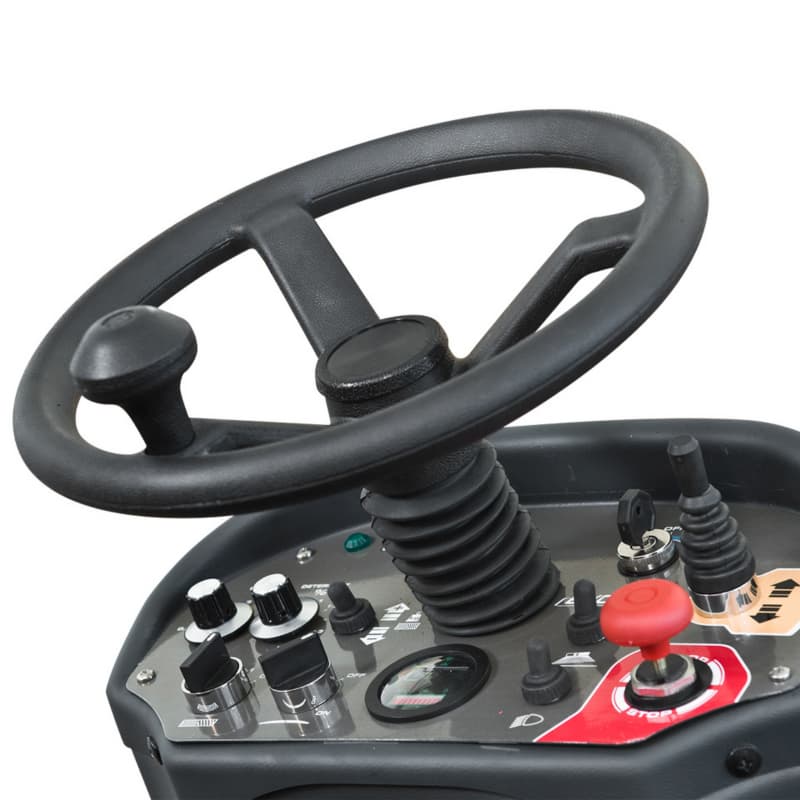 Panel kontrolny jest intuicyjny w obsłudze, wyposażony w licznik godzin oraz wskaźniki stanu naładowania baterii i poziomu zbiornika. Szczegóły:
