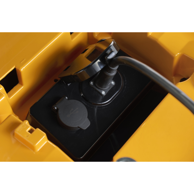 Stiga Estate 384e wyposażona w konsole na desce rozdzielczej, która zawiera przycisk start, stan baterii, alarm LED oraz wtyczkę USB.