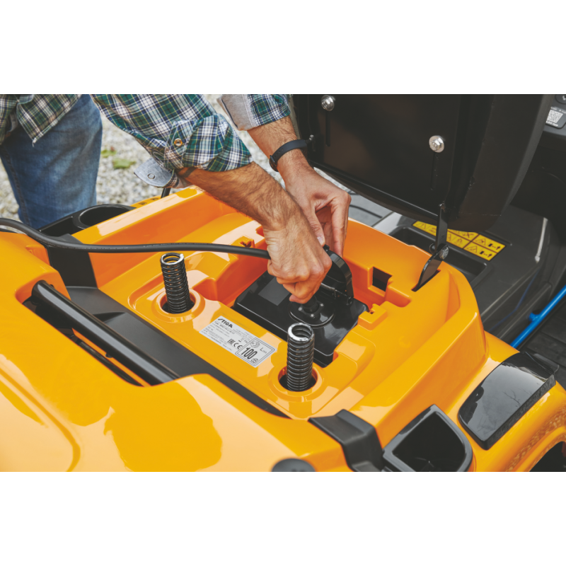 Traktor Stiga Estate 584e został wyposażony w akumulator litowo-jonowy o napięciu 48V i pojemności akumulatora 40Ah, dzięki czemu traktorek jest w stanie pokryć do 4000 m² w około 60 min.
