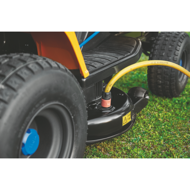 Po raz pierwszy w traktorze elektrycznym – innowacyjna funkcja złącza myjącego, która umożliwia łatwe czyszczenie platformy tnącej za pomocą węża wodnego.