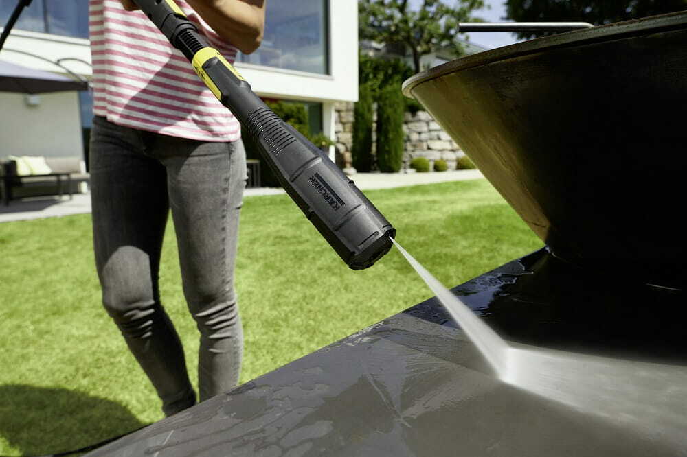 Dodatkowa dysza power umożliwia łatwe doczyszczanie narożników. Wygodny uchwyt umożliwia mycie powierzchni pionowych takich jak brama garażowa, mur czy ogrodzenie. Kratka ochronna zabezpiecza dysze przed uszkodzeniem podczas czyszczenia powierzchni pokrytych żwirem.