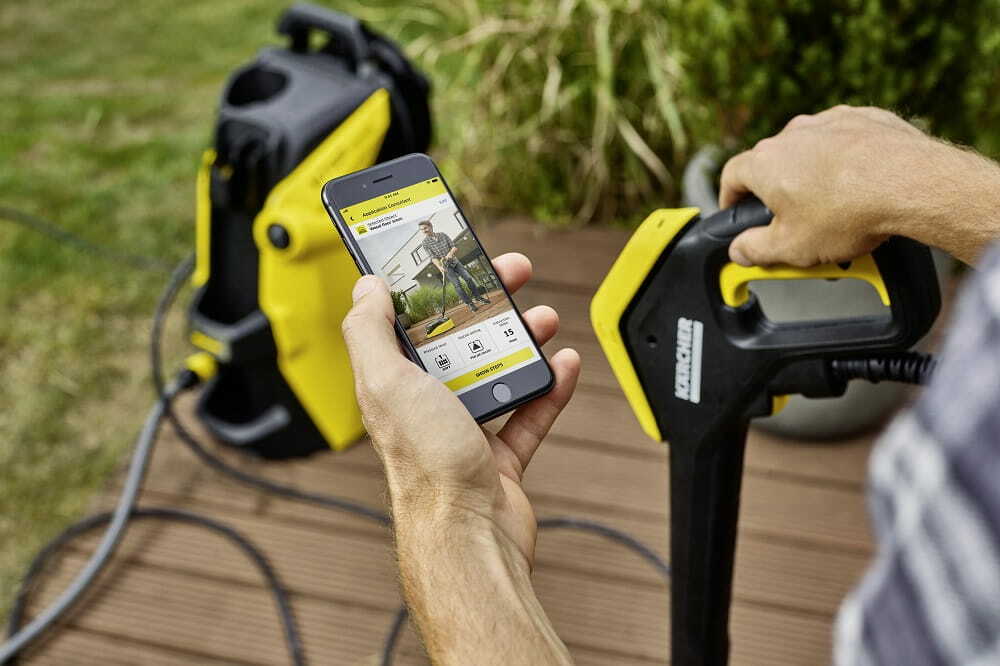 Myjkę można połączyć z aplikacją Kärcher Home & Garden na smartfonie przez Bluetooth. Konsultant mobilny w aplikacji zapewnia praktyczne porady i wskazówki dotyczące wielu sytuacji związanych z czyszczeniem oraz wielu czyszczonych obiektów. Nowa technologia Bluetooth pozwala wybrać w aplikacji rodzaj zabrudzeń do czyszczenia i automatycznie ustawić poziom ciśnienia w pistolecie. Aplikacja ponadto oferuje wiele innych przydatnych funkcji, takich jak instrukcje montażu, konserwacji i pielęgnacji, a także portal Kärcher Service.