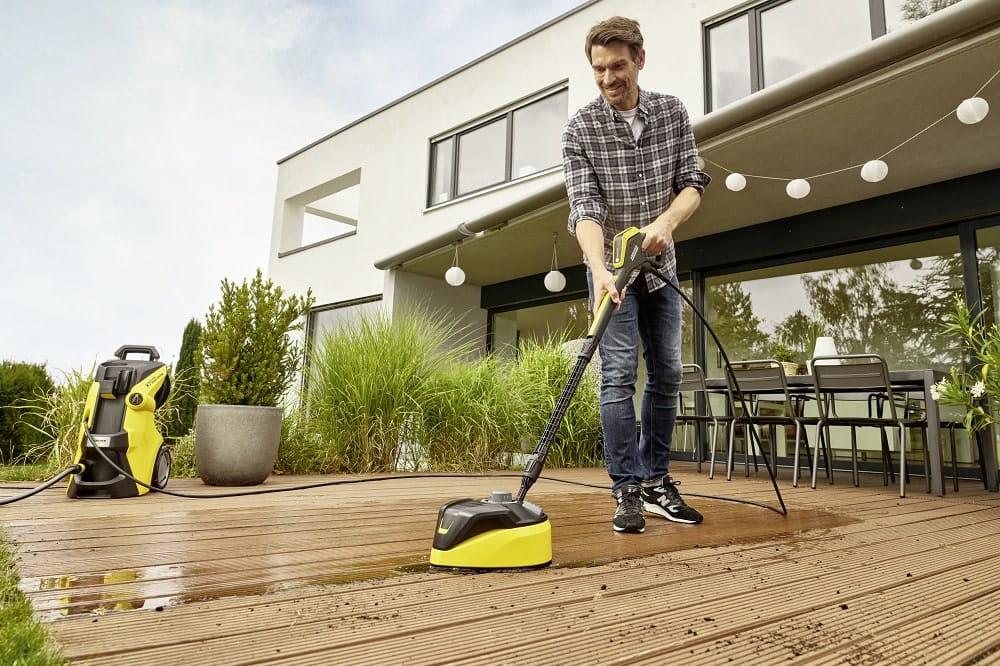 Zestaw Home idealnie nadaje się do utrzymania czystości wokół domu. W jego skład wchodzi przystawka T 7 do czyszczenia powierzchni płaskich (elewacja, podjazd etc.) oraz środek czyszczący do kamienia i elewacji 3 w 1.