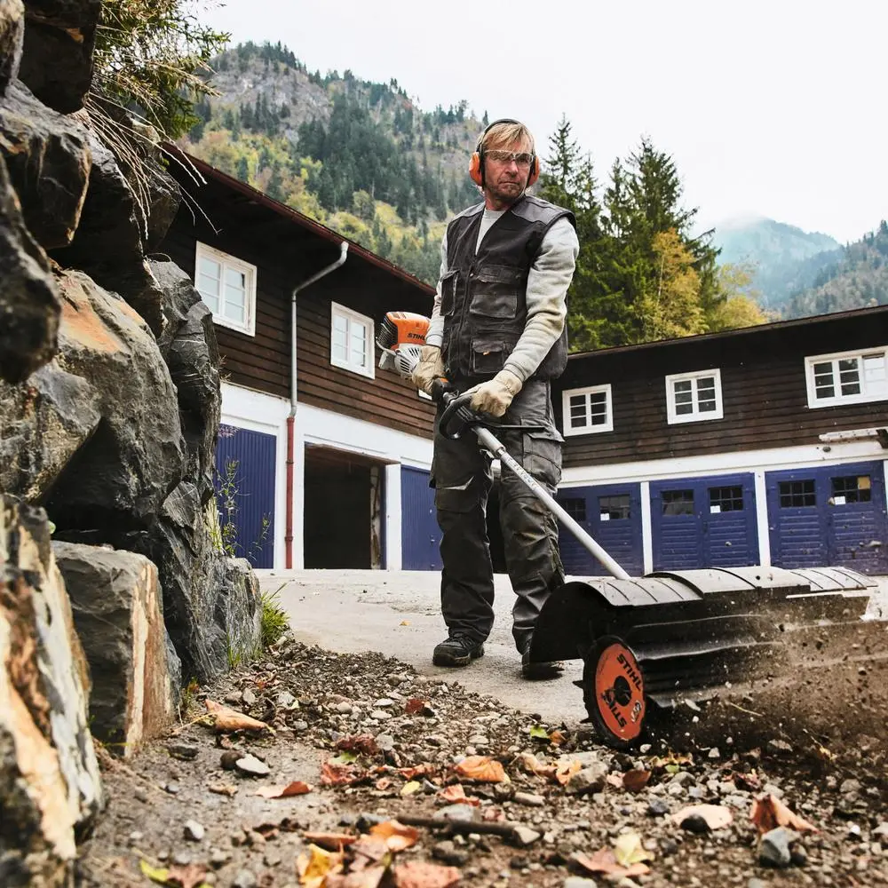 Uchwyt obwiedniowy umożliwia łatwe manewrowanie urządzeniem nawet w ciasnych przestrzeniach. Ogranicznik krokowy zapewnia bezpieczeństwo, chroniąc nogi i stopy przed zbyt bliskim kontaktem z nożami lub głowicami tnącymi.
