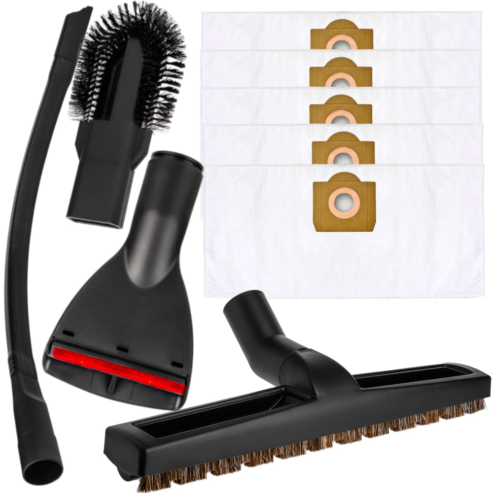 Zestaw akcesoriów do odkurzaczy Kärcher SE 4, WD 3, WD 2 oraz SE 4001. W komplecie znajdziesz wysokiej jakości worki flizelinowe oraz różne ssawki i szczotki, które ułatwiają dokładne czyszczenie każdego zakamarka.