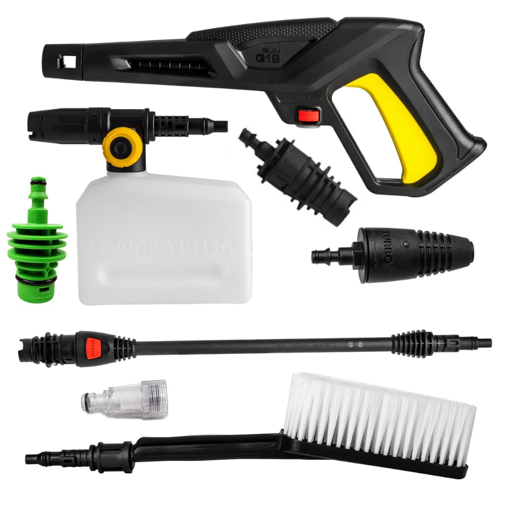 - Kompleksowe wyposażenie: W zestawie znajdują się wszystkie niezbędne akcesoria, takie jak pistolet ciśnieniowy, lanca, dysze (rotacyjna, regulowana, ECO), pianownica oraz szczotka szczelinowa, które umożliwiają różnorodne zastosowania.