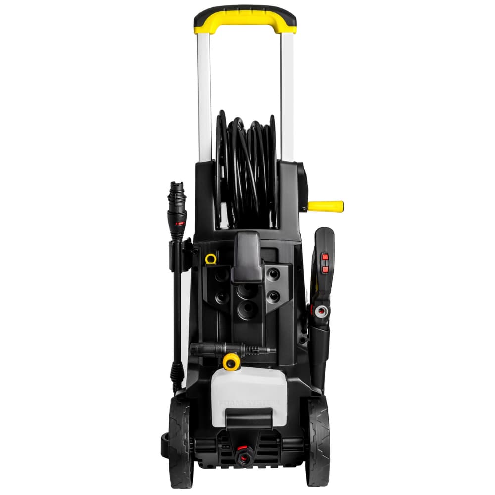 - Wszechstronność: Myjka posiada teleskopowy uchwyt transportowy, bęben na wąż oraz duże koła transportowe, co ułatwia jej przemieszczanie i przechowywanie, nawet na nierównym terenie.