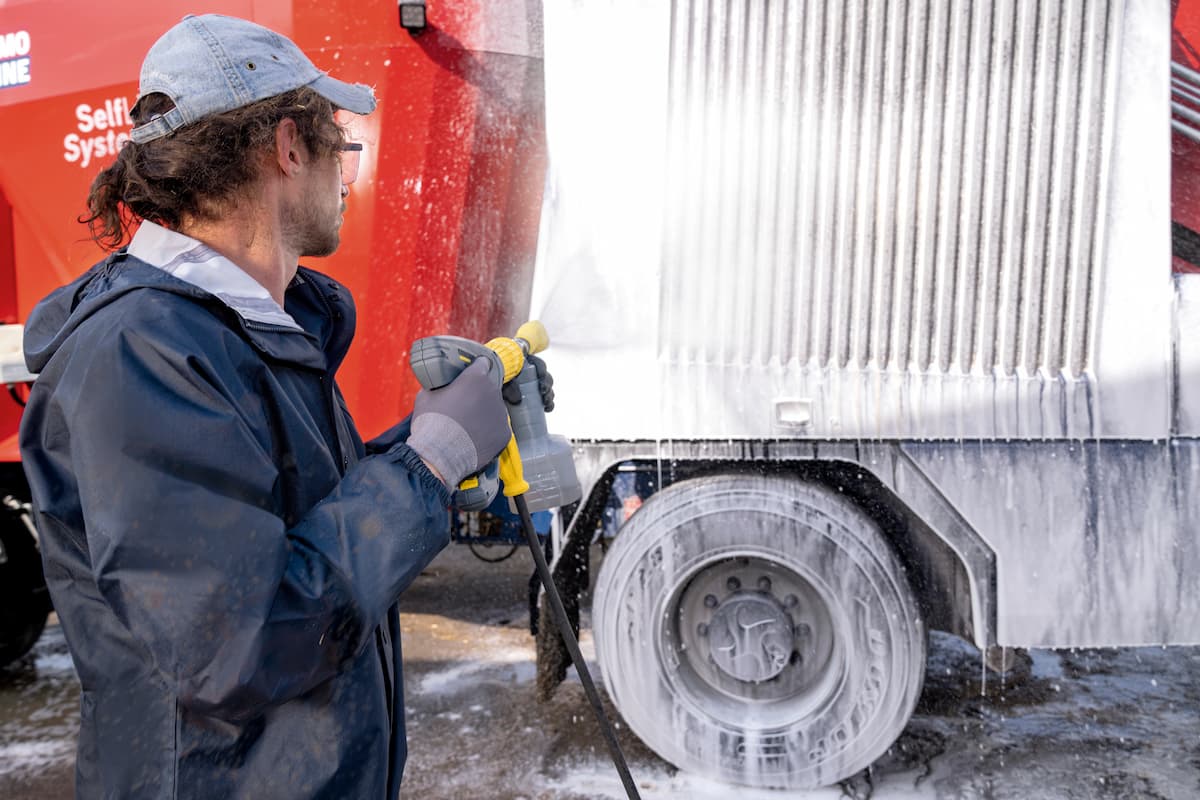 - Centralnie umieszczony, przejrzysty i intuicyjny panel kontrolny, wyświetlacz LED, uchwyty na lancę spryskującą.