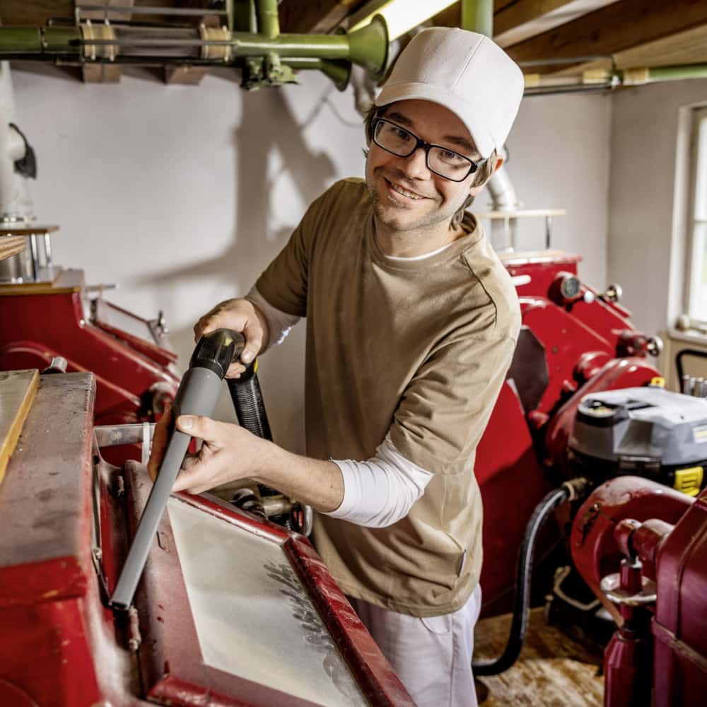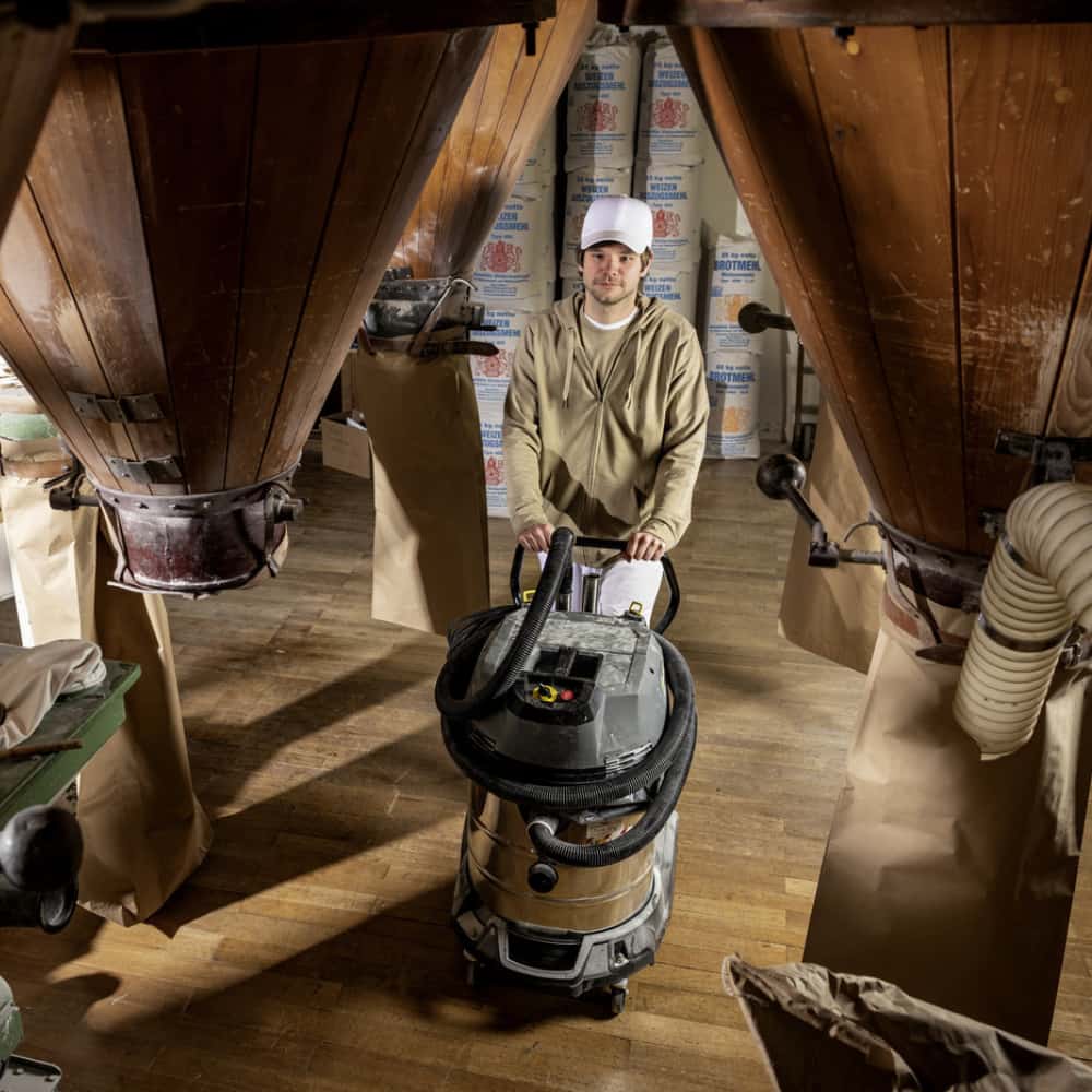 Jego konstrukcja, w pełni uziemiona i wyposażona w odpowiednie akcesoria przewodzące prąd, skutecznie zapobiega wyładowaniom elektrostatycznym. Odkurzacz posiada 75-litrowy pojemnik ze stali nierdzewnej oraz solidne podwozie z regulowanym uchwytem, co ułatwia usuwanie dużych ilości zanieczyszczeń. Model NT 75/1 Me Ec M Z22 wyposażony jest w płaski filtr falisty klasy M, który zapewnia efektywne zatrzymywanie pyłu na poziomie 99,9% i sprawdza się zarówno w pracy na mokro, jak i sucho. Urządzenie może być używane bez worka filtracyjnego lub worka na odpady – w takim przypadku można zastosować opcjonalny filtr kartridżowy do drewna, zaprojektowany do odkurzania włóknistych zanieczyszczeń bez użycia worka filtracyjnego.