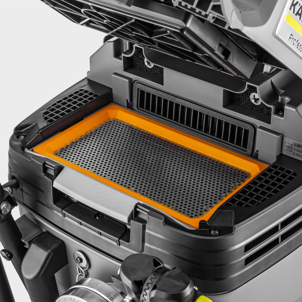 Odkurzacz NT 50/1 Mwf jest wyposażony w zaawansowany system filtracji, który skutecznie chroni pompę przed zanieczyszczeniami, takimi jak kamienie czy liście, zapobiegając jej zablokowaniu i zapewniając długotrwałą wydajność. Dodatkowo, posiada wyłącznik ochronny PRCD-K, który zabezpiecza przed porażeniem prądem elektrycznym, zwiększając bezpieczeństwo użytkowania w wymagających warunkach pracy.