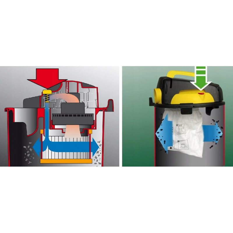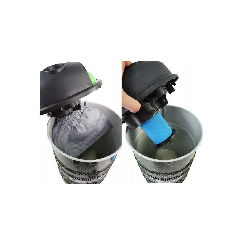 Duży 30 litowy zbiornik gwarantuję długa pracę bez konieczności częstego opróżniania odkurzacza. Do zbiornika zbierać można zarówno suche, jak i mokre zanieczyszczenia. Zmieści się tu do 15 litrów płynu, po osiągnięciu tego poziomu pływak umieszczony w koszu filtra podnosi się, powodując wyłączenie się silnika. Rozwiązanie tego typu zwiększa klasę bezpieczeństwa urządzenia i chroni użytkownika przed ewentualnym porażeniem prądem.
