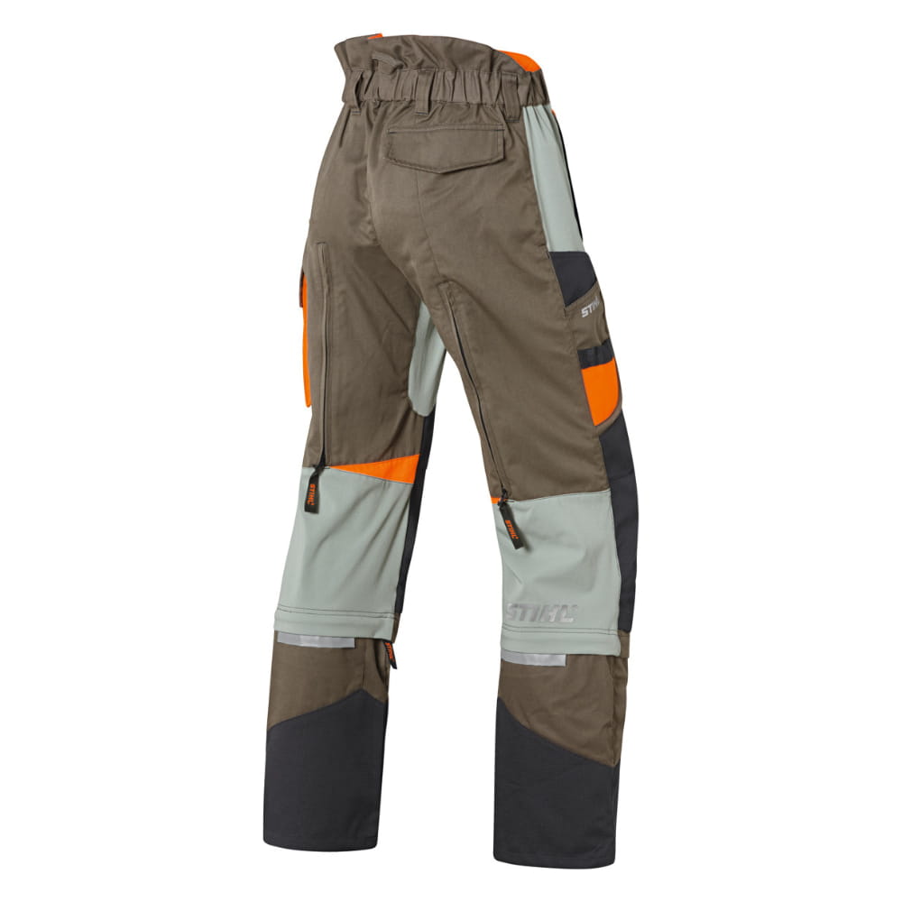 Idealne do pracy nożycami do żywopłotów. Spodnie w kolorze torf, wykonane z 65% poliestru i 35% bawełny, wyposażone w elastyczny stretch zapewniający optymalną swobodę ruchów. Wodoszczelna strefa kolan oraz dolna część nogawek gwarantują ochronę w trudnych warunkach. Materiał wierzchni z efektem „Wash-out” z dużym udziałem bawełny zapewnia maksymalny komfort noszenia. Spodnie posiadają długie otwory wentylacyjne z zamkami błyskawicznymi w tylnej części nóg, umożliwiające regulację temperatury. Nogawki można odpiąć, uzyskując długość 3/4, co zwiększa funkcjonalność. Dodatkowo, spodnie wyposażone są w osłonę nerek, zapewniającą dodatkową ochronę i komfort podczas pracy.