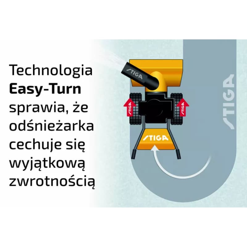 - Technologia Easy-Turn: Ułatwia obracanie odśnieżarki, co jest szczególnie przydatne w ciasnych przestrzeniach.