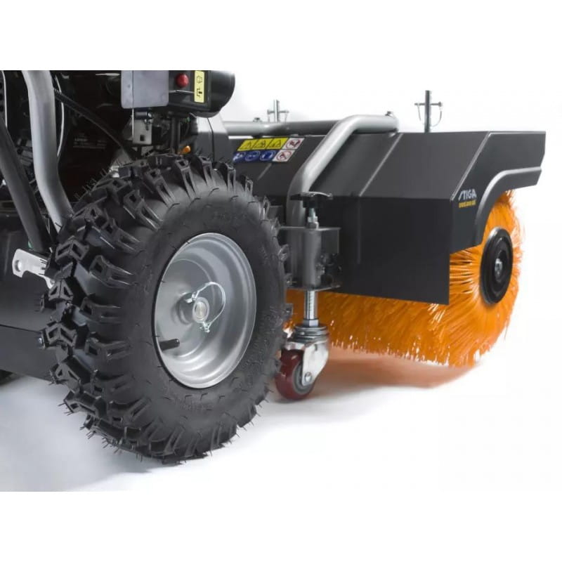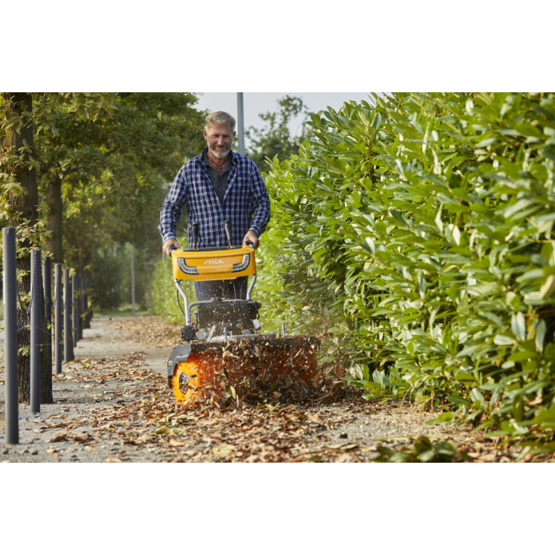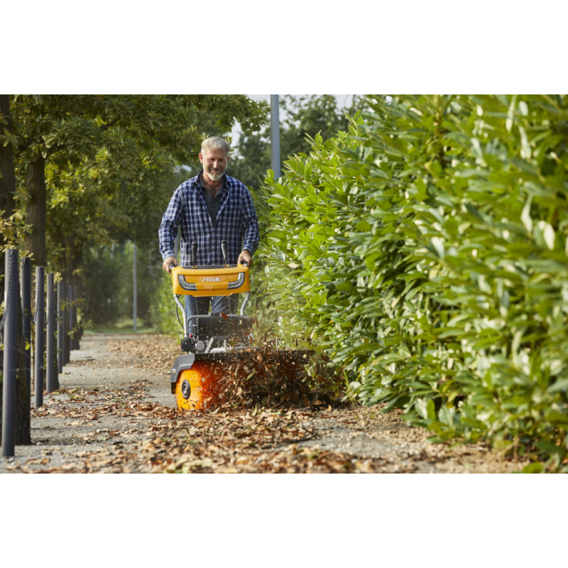 Szeroką nylonową szczotkę (80 cm) można ustawić w trzech różnych pozycjach, co czyni tę maszynę idealną do odśnieżania, usuwania liści, ścinków trawy i innych śmieci przez cały rok.
