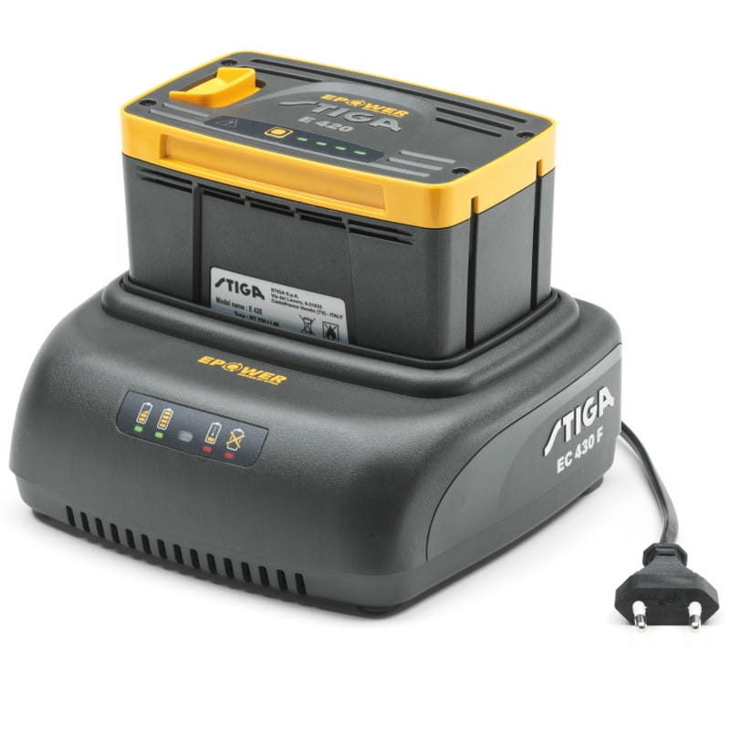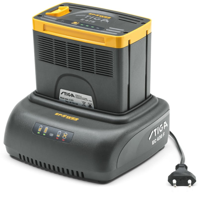 Szybka pojedyncza ładowarka Stiga EC 430 F wyposażona we wtyczkę EU, z dostępnym jednym gniazdem do ładowania.