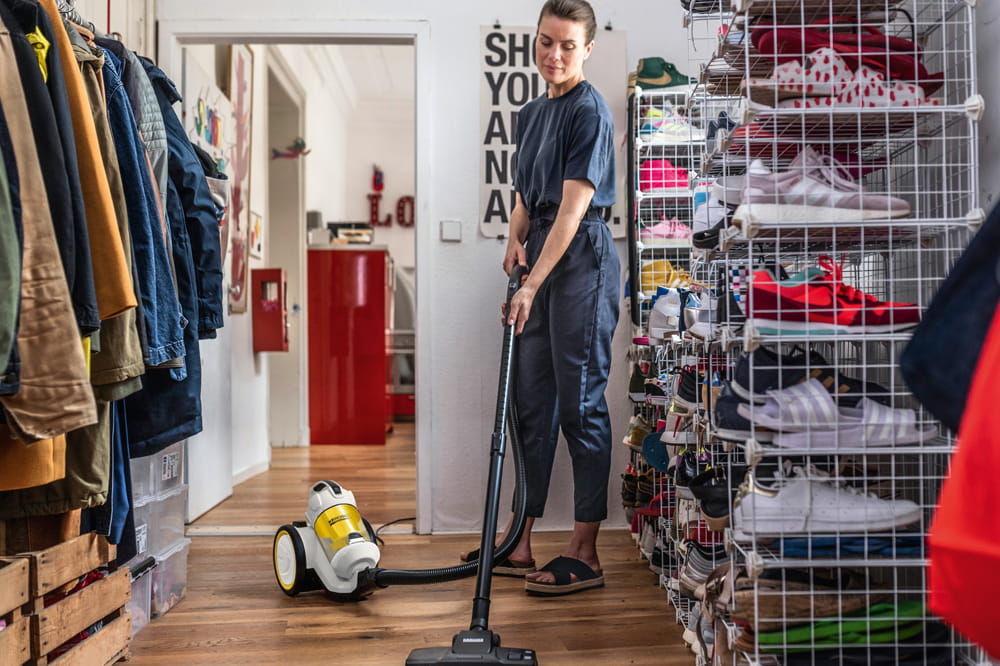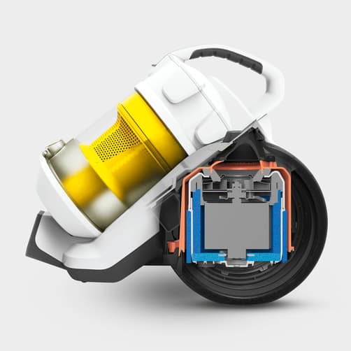 Multicyklonowy odkurzacz VC 3 oferujący bardzo wysoką siłę ssania. Łatwy w czyszczeniu zbiornik zastępuje worek filtracyjny i jest przeźroczysty co zapewnia widoczny efekt czyszczenia.