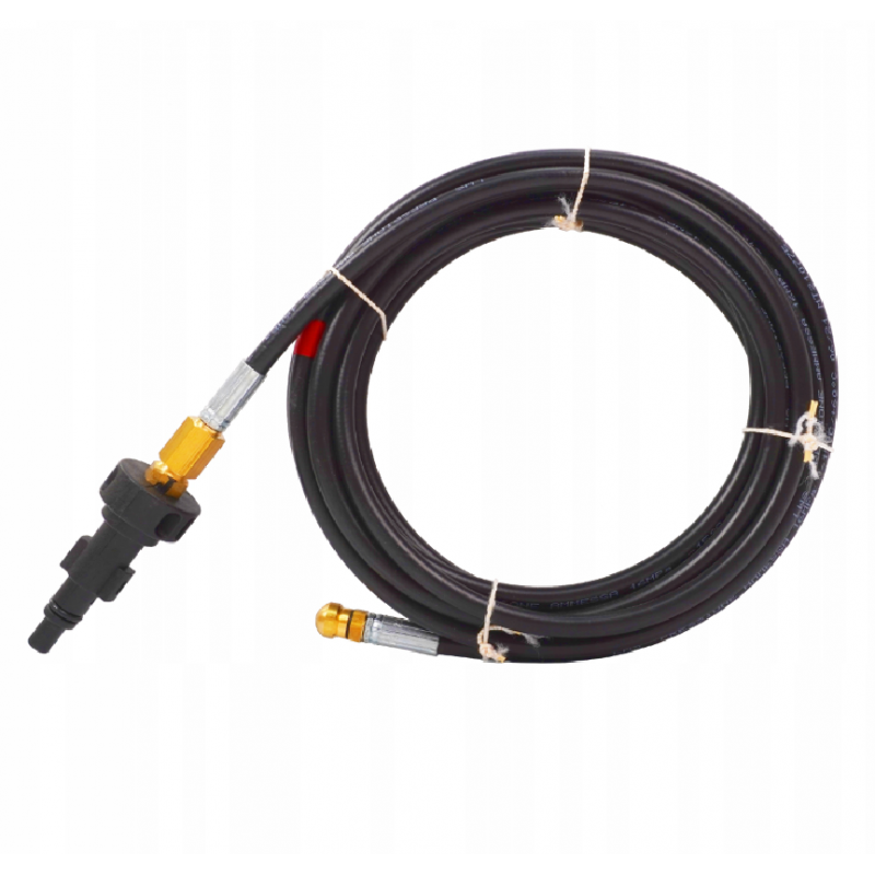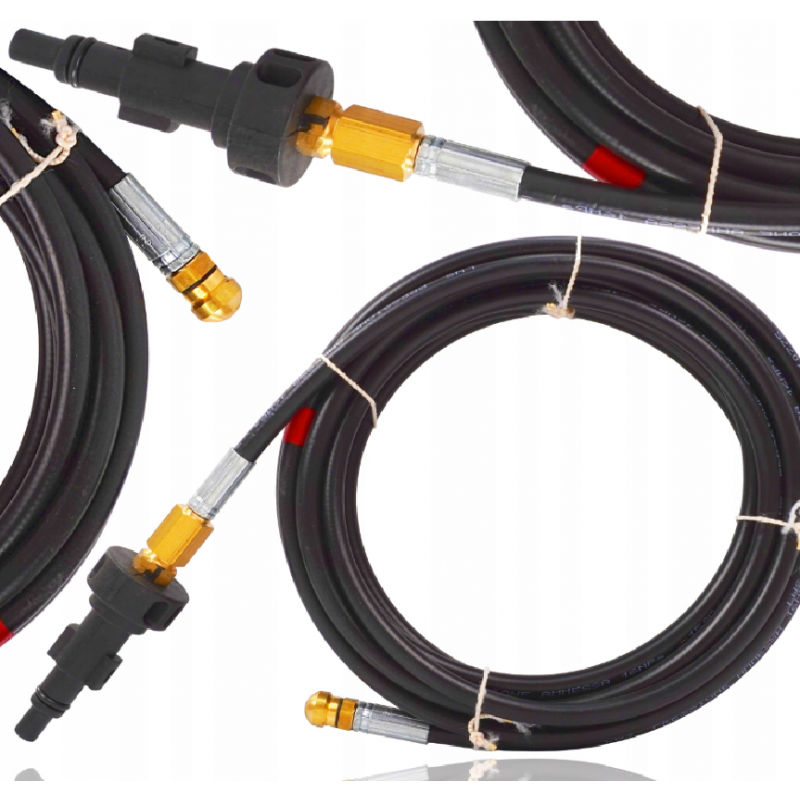 - Strumienie wysokociśnieniowe skierowane do tyłu wprowadzają wąż do rury udrażniając ją. 6 metrowy elastyczny wąż wysokiej jakości wzmocniony oplotem nylonowym z mosiężną dyszą, zapewniający łatwe przemieszczanie się w rurze.