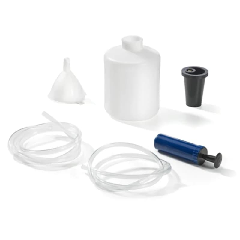 Zestaw podciśnieniowy z pompką ręczną do odsysania oleju i paliwa z silników spalinowych zastosowanych w urządzeniach ogrodniczych. Pojemność zbiornika na odessane paliwo i olej wynosi 1,6 Litra.